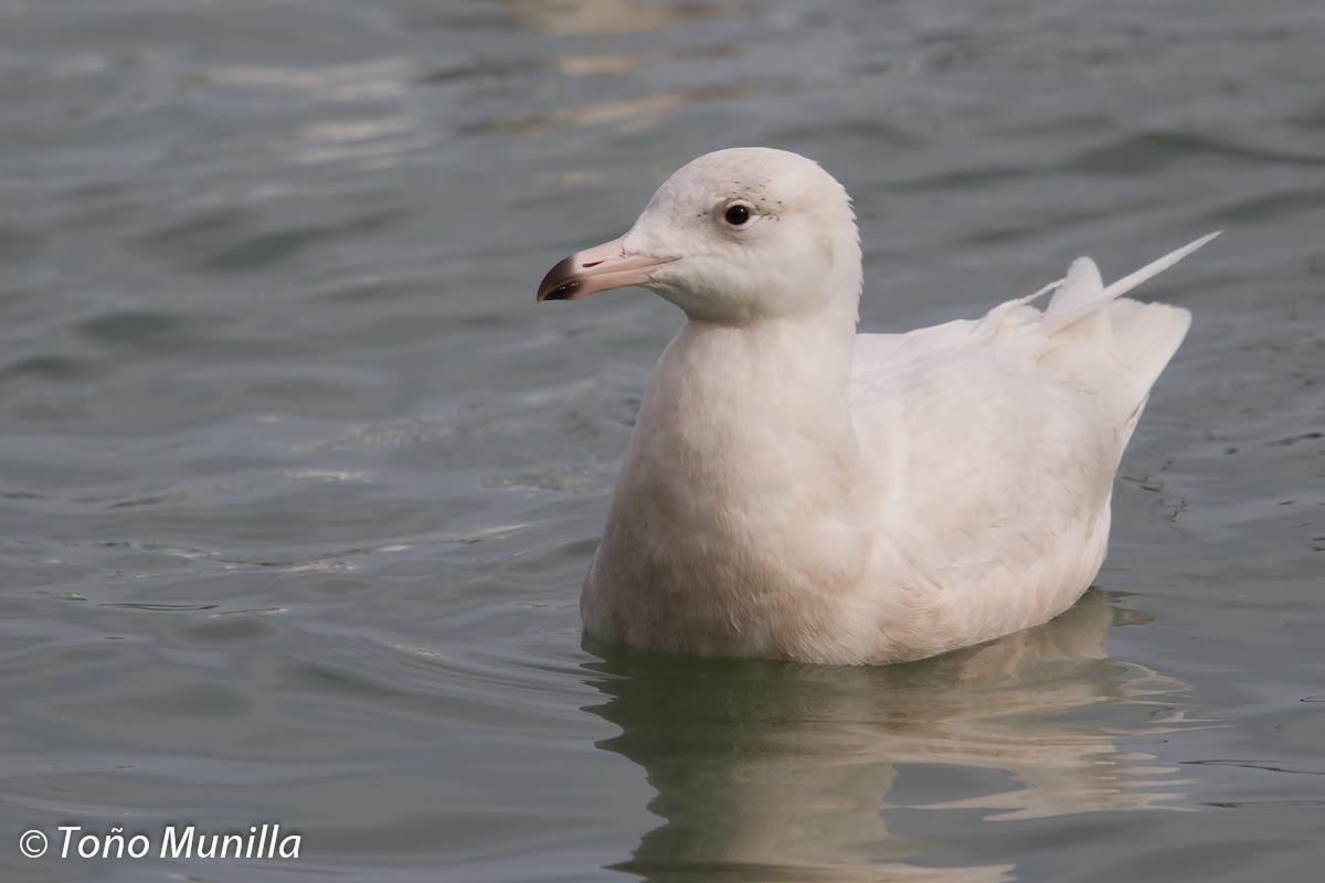 El domingo Jorge, Montse y el mendas nos desplazamos a Getxo para intentar observar y fotografiar a la gaviota hiperbórea que se estaba viendo por esta zona desde hacía varios días. Allí habíamos quedado con el amigo Oscar Carazo, conocedor de la zona y que ya había visto a la hiperbórea tanto en Getxo como en su pueblo, Santurtzi. Nada más llegar tuvimos la suerte de verla, posada en las rocas que deja al descubierto la bajamar, junto a la playa de la Bola. Para primera hora de la mañana éramos un montón de pajareros los que disfrutamos de la observación de esta llamativa gaviota. Para algunos de nosotros era la primera vez que veíamos a esta especie. También pudimos observar a placer a un ejemplar de gaviota de la Delaware. La presencia en el concurrido paseo de Getxo de tantas personas con telescopios, prismáticos y cámaras llamaba a su vez la atención de los paseantes.